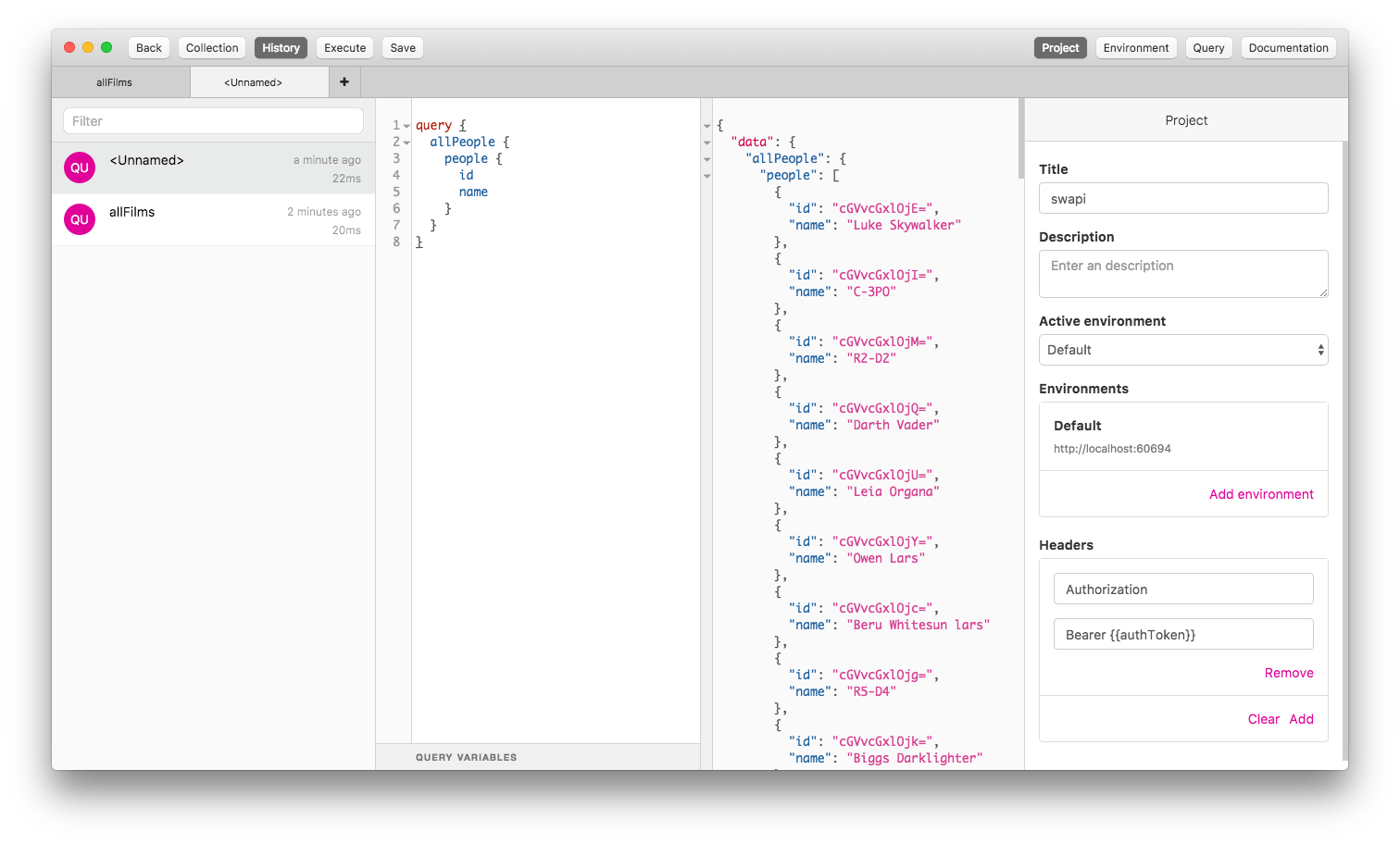 GraphQL IDE is an extensive IDE that allows you to manage projects, store queries, toggle history, and set environment variables for dynamic headers.